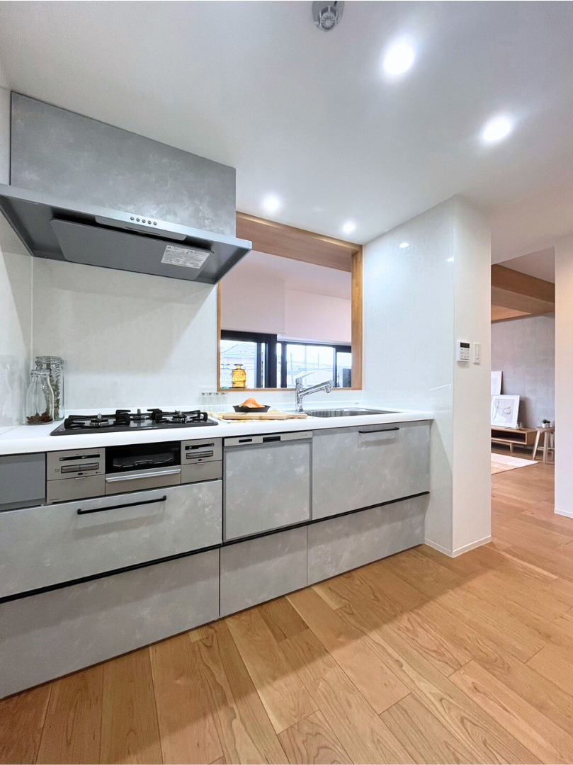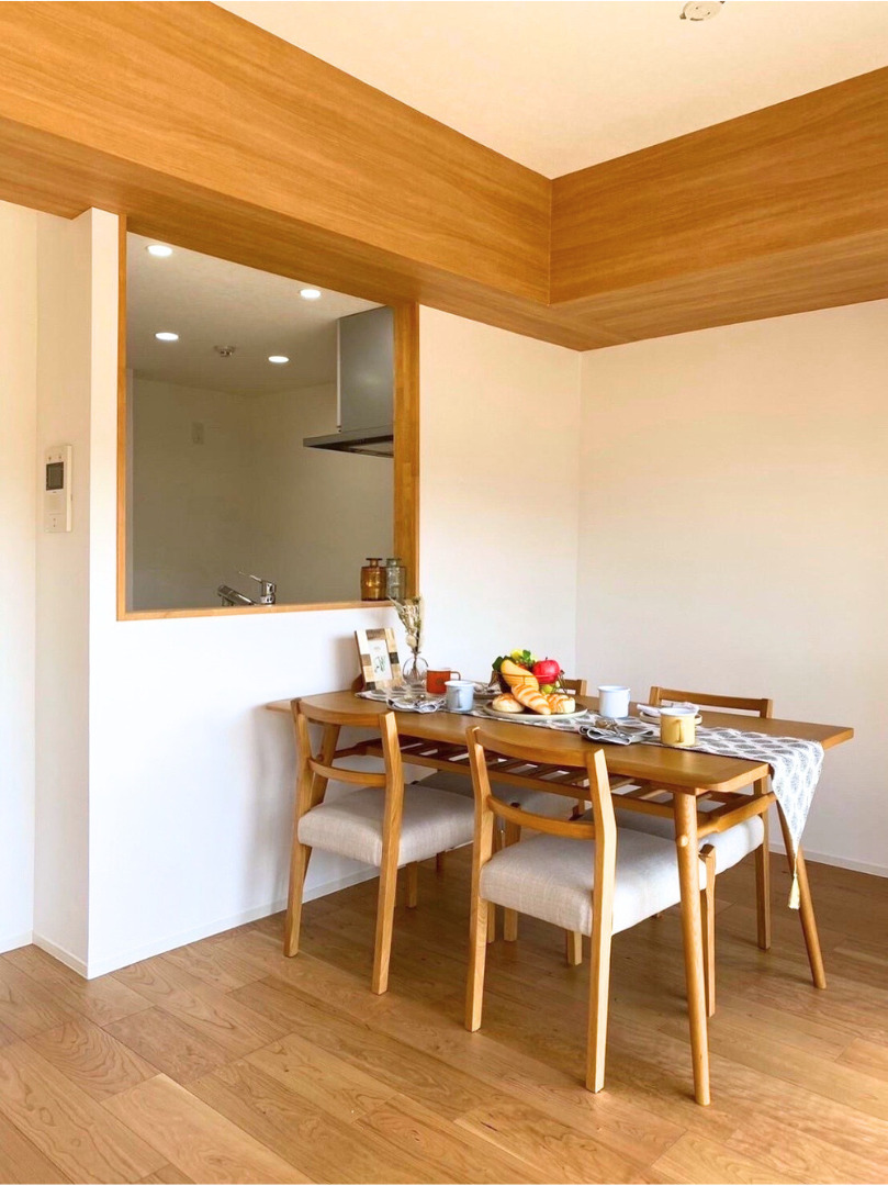 キッチン前は開口を大きくして家族間のコミュニケーションが取りやすいように。オープンになりすぎないため、見せたくないものは隠しておける間取りです。