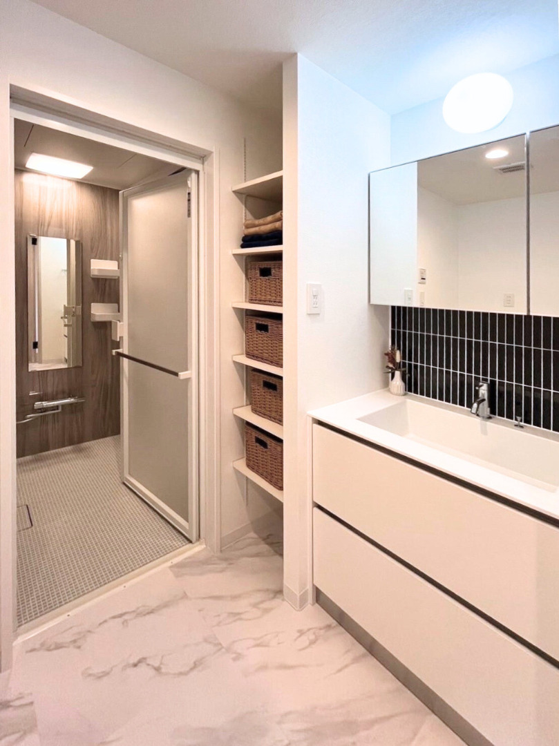 洗面台には清潔感のあるネイビーのタイルを使用。可動棚で収納量も十分確保しています。